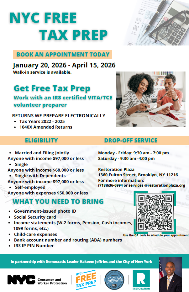 The NYC Department of Consumer and Worker Protection (DCWP) provides free tax preparation services for families who earned $93,000 or less or singles who earned $65,000 or less in 2025. Please visit NYC Free Tax Prep – ACCESS NYC to learn more about what to include and how to apply, as well as the IRS website for general guidance. You can find more information for small businesses by visiting Small Businesses Self-Employed | Internal Revenue Service.