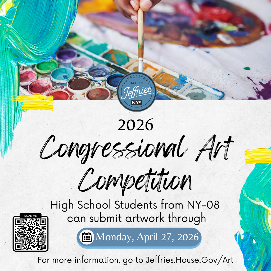 Congressman Hakeem Jeffries would like to invite students to participate in the annual Congressional Art Competition. Each spring, a nationwide high school arts competition is sponsored by the Members of the U.S. House of Representatives. The Artistic Discovery Contest is an opportunity to recognize and encourage artistic talent in the nation. This competition is open to any high school student who resides in New York’s 8th Congressional District and creates an original work of art.